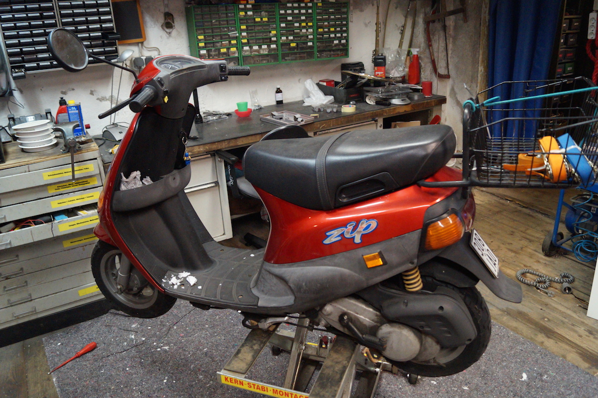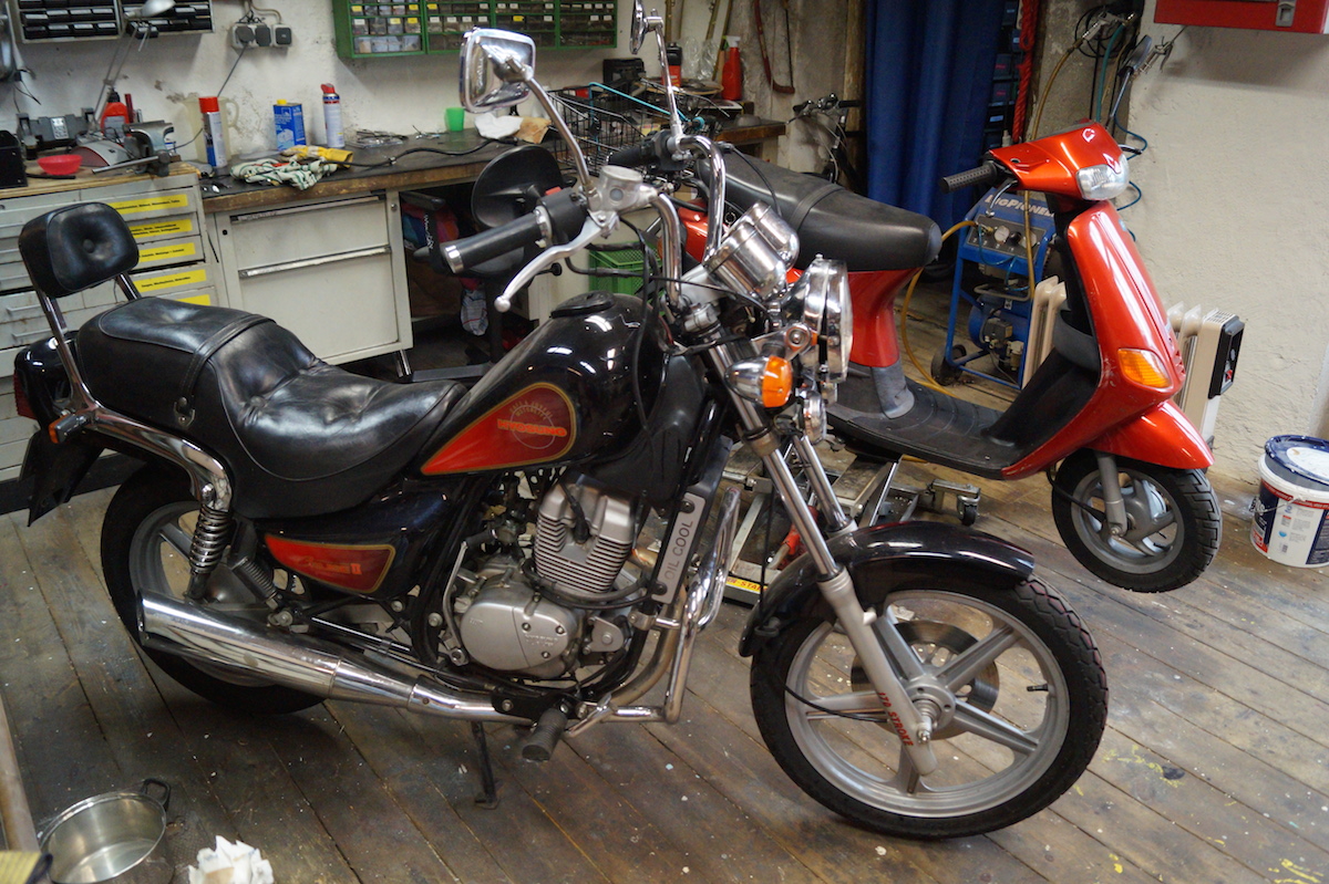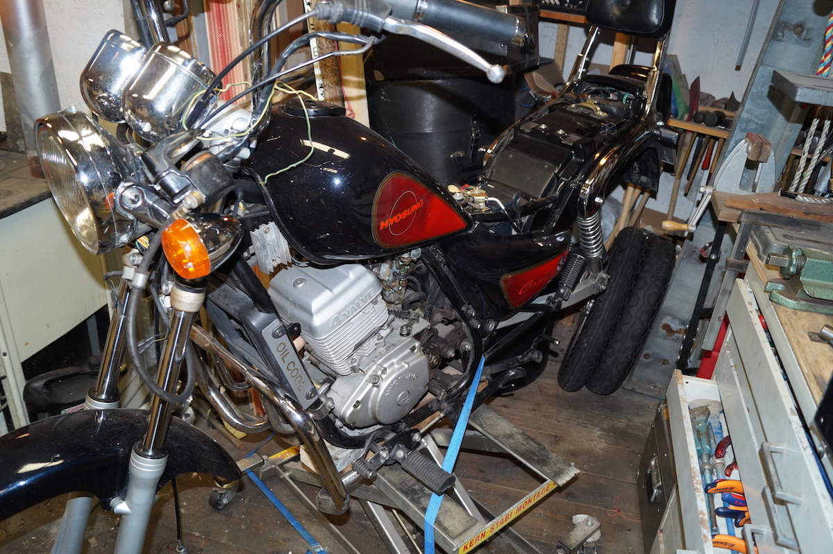 Diagnose lt. TÜV (durchgefallen) Benzinschlauch undicht (o.k.) Gabel krumm (Schmarrn, ist nur verdreht) Kette und Ritzel hinüber (stimmt), Reifen (o.k. Erstausstattung, lt. DOT Nummer aus 1996 und wir schreiben das Jahr 2016 - damit sollte man nicht mehr rumfahren), vordere Bremse - Bremsbeläge. Es sollte schlimmer kommen...